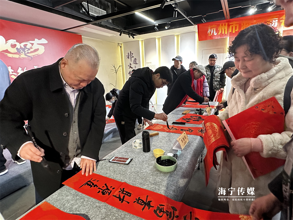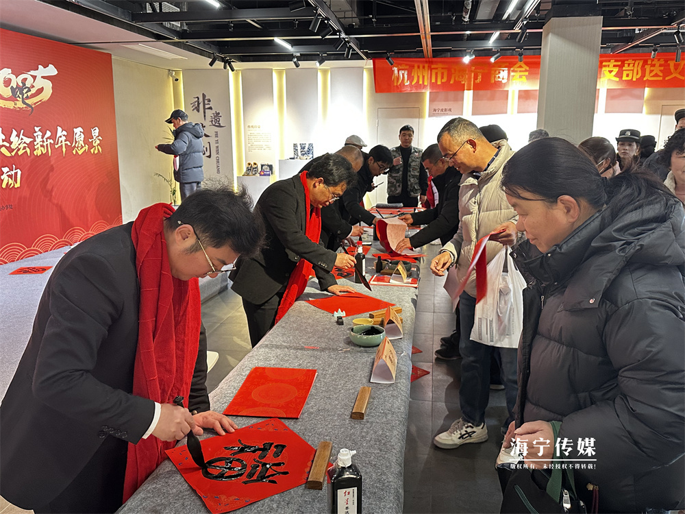 1月18日晨光初照,杭州市海宁商会携送“福”写春联回乡活动在海宁市非物质文化遗产馆内热烈展开。来自省书法家协会、省青年书法家协会、乐石社的八位书法大家亲临现场,挥毫自如,为市民们倾情献上满载新春祈愿的墨宝,共启新岁之吉祥与和谐。