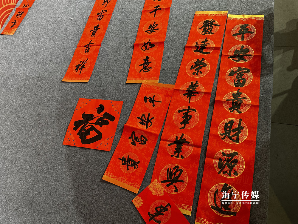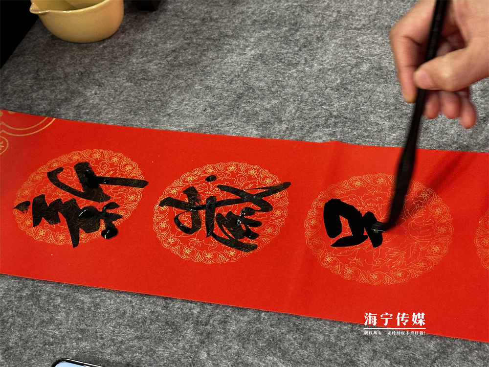 南沙先生对参加此次杭州市海宁商会组织的送“福”写春联活动深感荣幸,这是他首次回乡献艺。他感慨道:“春联是中华民族独有的文化瑰宝,亦是春节不可或缺的文化符号。手写春联是对传统习俗的深情传承,让年味更加醇厚。”